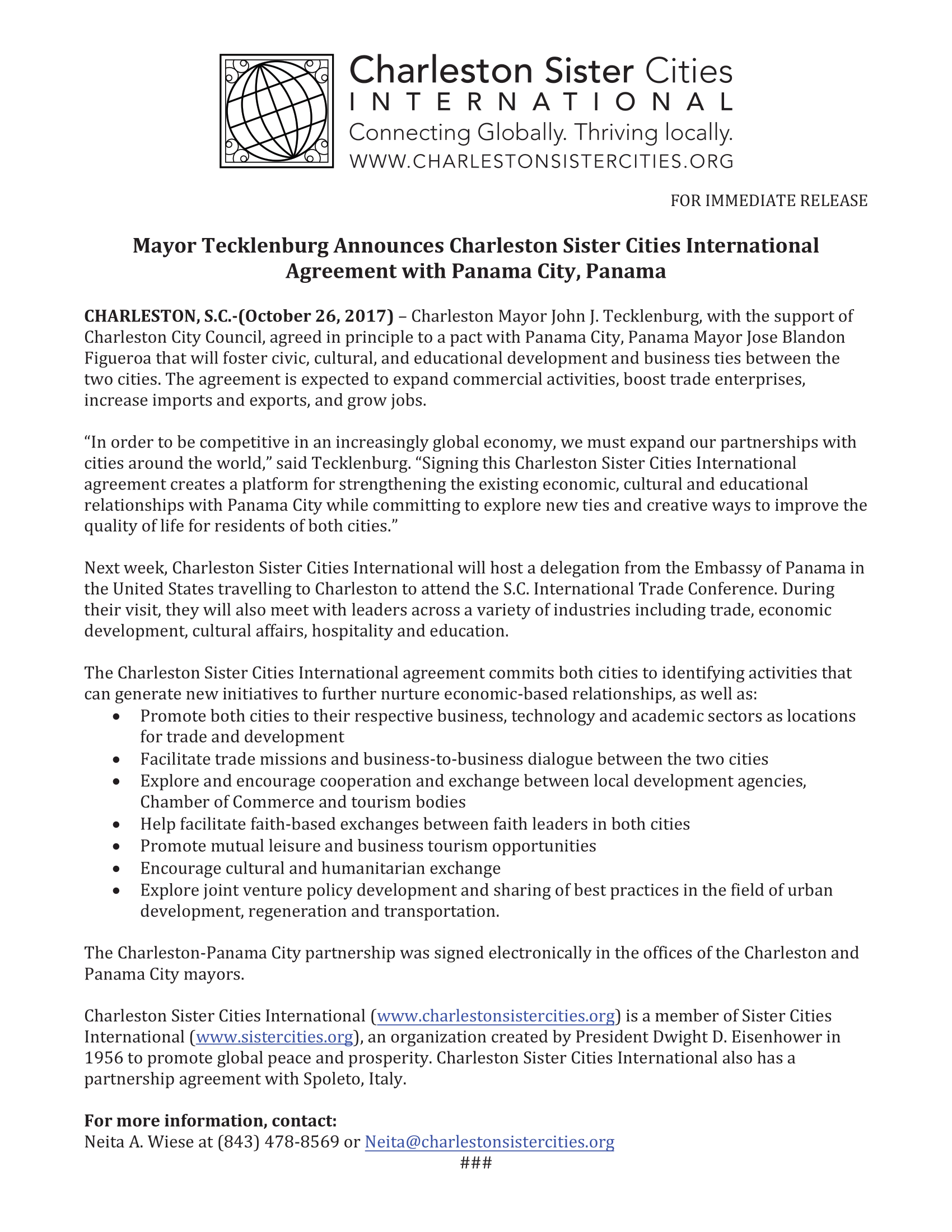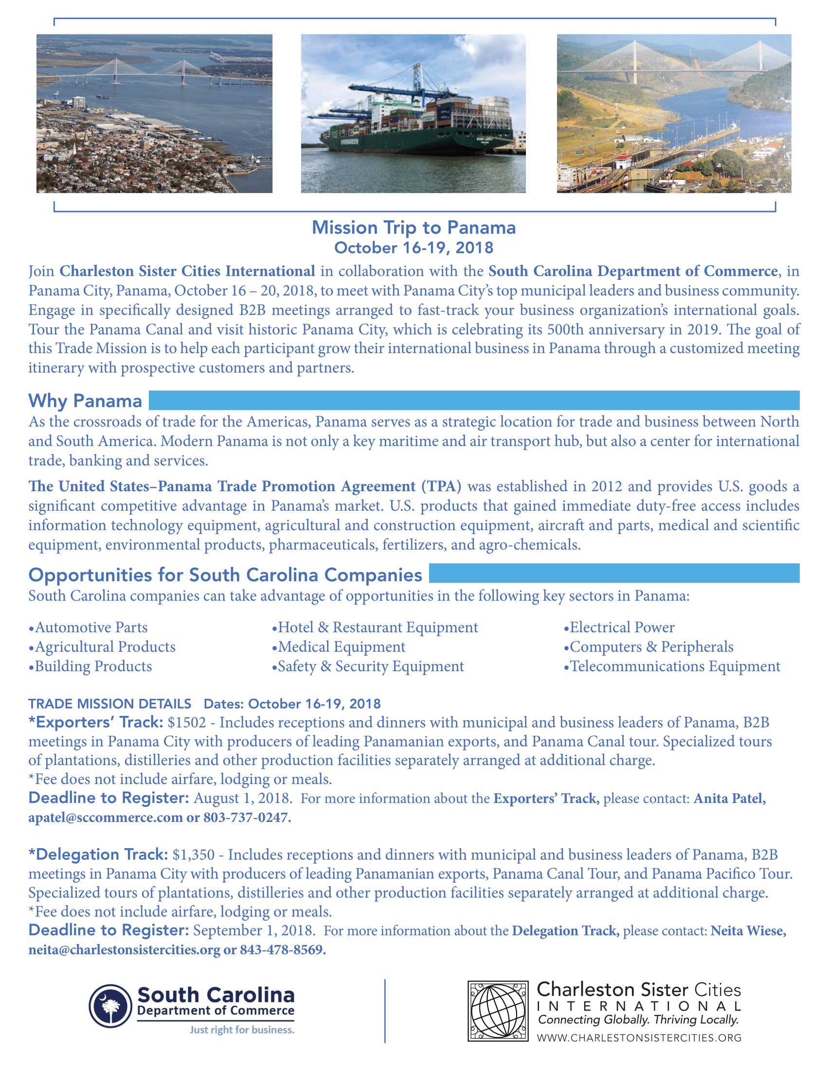October 2018: Panama City Panama - https://www.charlestonsistercities.org/charleston-sister-cities-trade-mission-to-panama-city